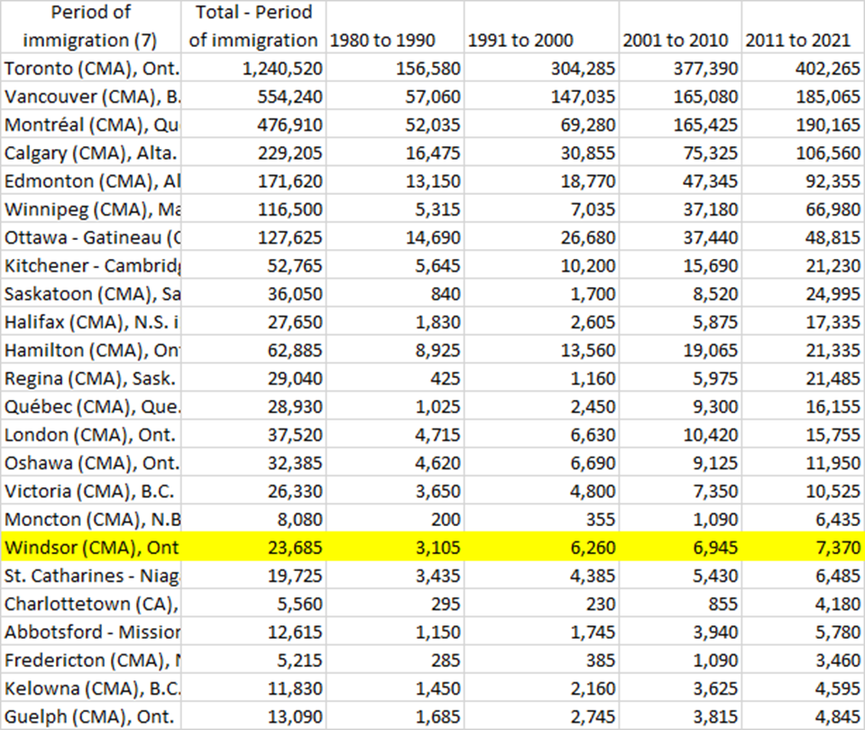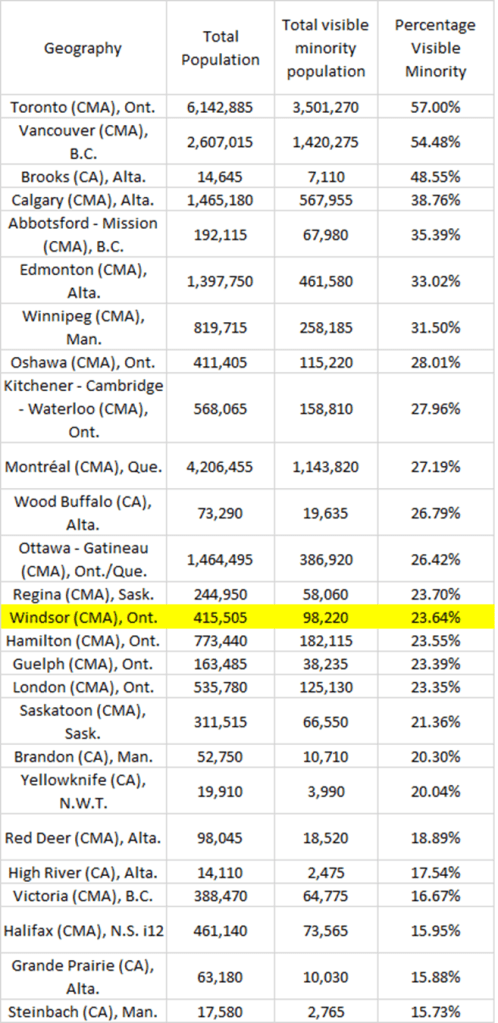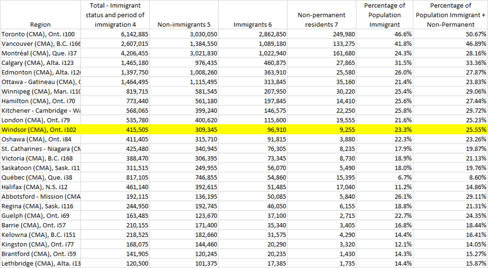 Let’s just frame where Windsor Essex is from an immigration standpoint in Canada. The out of date narrative that we are 4th most, 6th most diverse or welcoming community doesn’t hold up anymore.