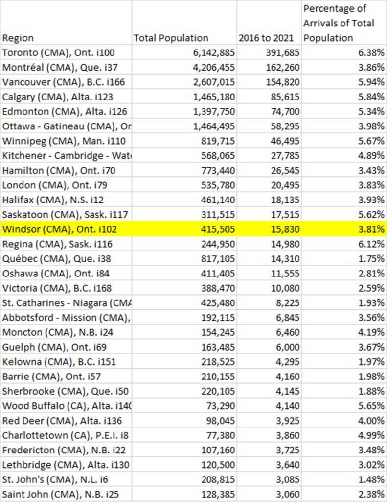 We as a community took the 13th most new immigrants between 2016-2021. But as a percentage of total population we fall to 18th as a number of smaller communities too larger shares of newcomers. I am happy to accept that there may be a some increase since the 2021 Census year (that data will be available soon) but the question that has to be tackled if you are talking increasing poverty levels is how big of proportional increase of low income immigrants is there? A three percent increase from immigration over a 5 year period is not nothing, but it is certainly not overwhelming, given that the average increase of the top 25 cities was 3.87% the Windsor Essex region was actually below average at 3.81%.
