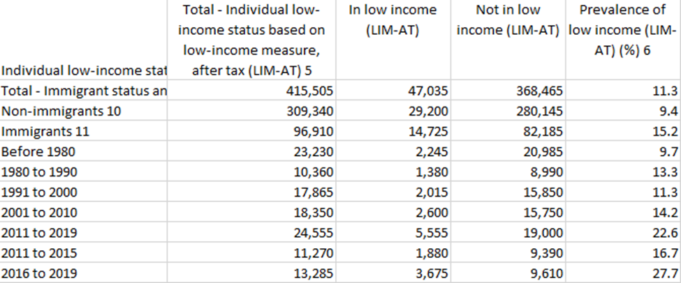 I am happy to concede nor am I surprised that more recent immigrants have higher rates of low income. It is important to contextualize this by two factors: first, what is the proportion of immigrants vs non-immigrants living in low income and has that number been stable over time. Looking back at the 2016 Census for this data you find 17,000 immigrants in low income and 36,000 non-immigrants. Since this was pre-Canada Child Benefit and some other changes of the federal Liberals which provided support to a wide range of families in low income situations these numbers have declined from a structural sense and were further suppressed by COVID programs like CERB (that our region disproportionately benefited from). That being said the approximately ratio of 2 non-immigrants living in low income for every immigrant remained pretty consistent in the 2020 COVID Census so to simply say that we have lots of immigrants here that is why our poverty is bad is factual not true.