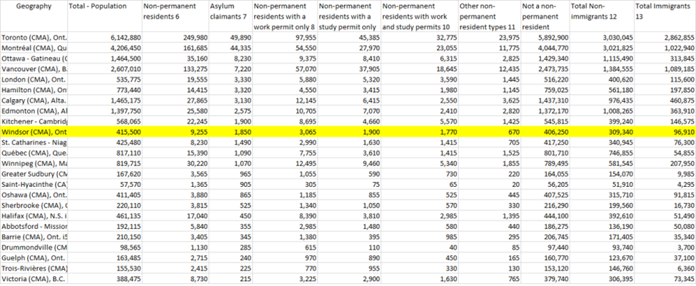 Based on the above the Windsor CMA ranks 11th for immigration. This regional data from the Census so it is NOT just the City of Windsor and I will be using regional data throughout the piece as that is more relevant and easier to access in many cases. The table above is sorted by total immigrant population. About 96,000 immigrated to our community which is significant, but not in the top 10. As percentage we do climb into the top 10 but outliers like Abbotsford BC (dealing with spillovers from Vancouver region) jumps over us as well. We fall back a bit further if we include temporary/non-permanent residents which are international students (I’ll get to that in a minute) and temporary foreign workers.