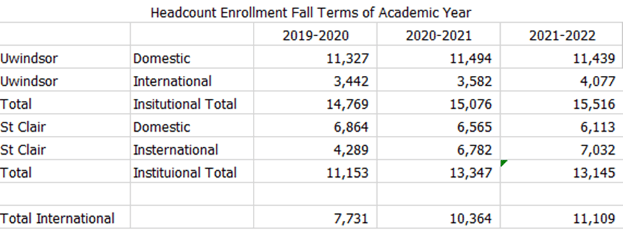 It is more complicated then the totals that are reported. That is because in Sept 2021 the same year as this data, St Clair College announced that over 3,000 of their international students would be going to the Toronto Satellite Campus. These students are NOT enrolled in at the Windsor Campus but they are St Clair College students and captured in the headcounts above and if you look in the open data the campus specific enrollment, you see the Toronto Campuses having approximately 3,000 student enrolled. It is unlike these students will ever step foot in Windsor or if they would come here they would not be captured in the data that was discussing.