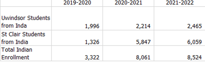 I have heard the value that 15,000 Indian students have come to the community/region. To the nationality of the students enrolled locally, it can also be found in the same open datasets, as the headcounts. St Clair College had 6,059 students in 2021 and the University of Windsor had 2,464 students from India. It is possible that it didn’t mean in 1 year, looking at this Indian student population over the last 3 years we see this.