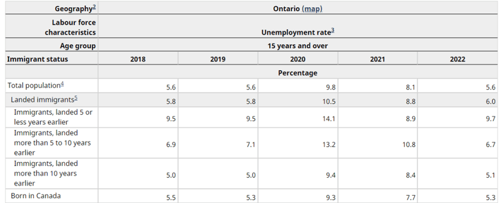 You can see the annual average unemployment rate by immigration grouped by time in Ontario. You will note that recent immigrant unemployment rate in Ontario is about 4% higher than the total population if we compare to some recent data for Windsor.