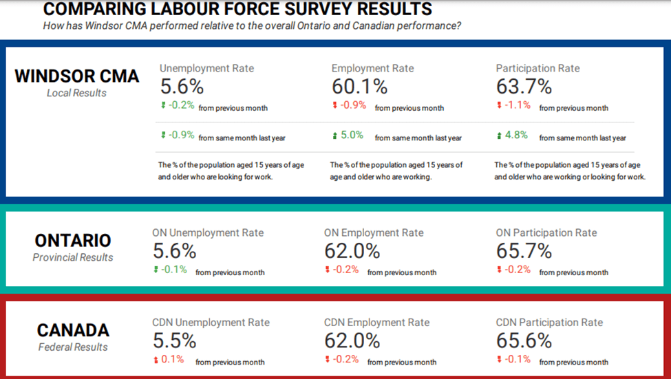 The more worrying statistics is the Participation Rate. Windsor for the past decade has had lower participations rate with 2-3% of our population more or less just opting out of trying to find work. For some that is a choice, a parent staying home with their child, for many newcomers it learning the language or upskilling and not immediately looking for work. It is possible that this rate is slightly lower due to our newcomer population