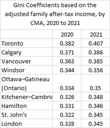 This brings me to the income inequality part of the conversation. The Windsor region have the 4th highest income inequality in Canada. To be clear on a few points, income inequality in Canada isn’t as bad as in the US or a number of other countries. Canada’s social safety net, although flawed, and income transfers like OAS, CCB, GST/HST make significant impacts for lower income households. Many of these can be accessed as soon as someone is a permanent resident and files proper paperwork and/or income taxes.