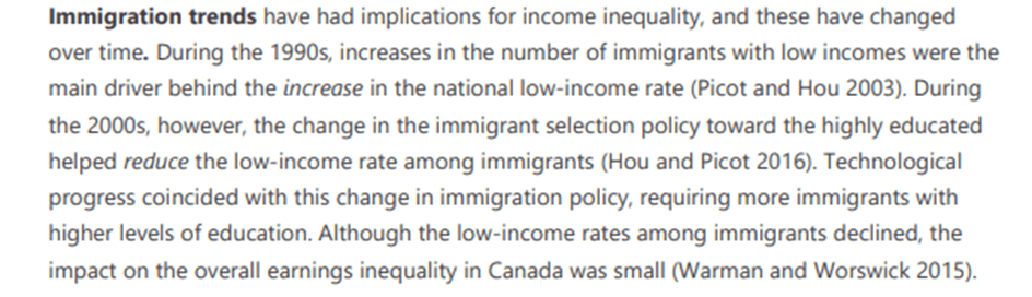 The Bank of Canada report from above cited above when the looked at the immigration trends and their impact on income inequality they found: