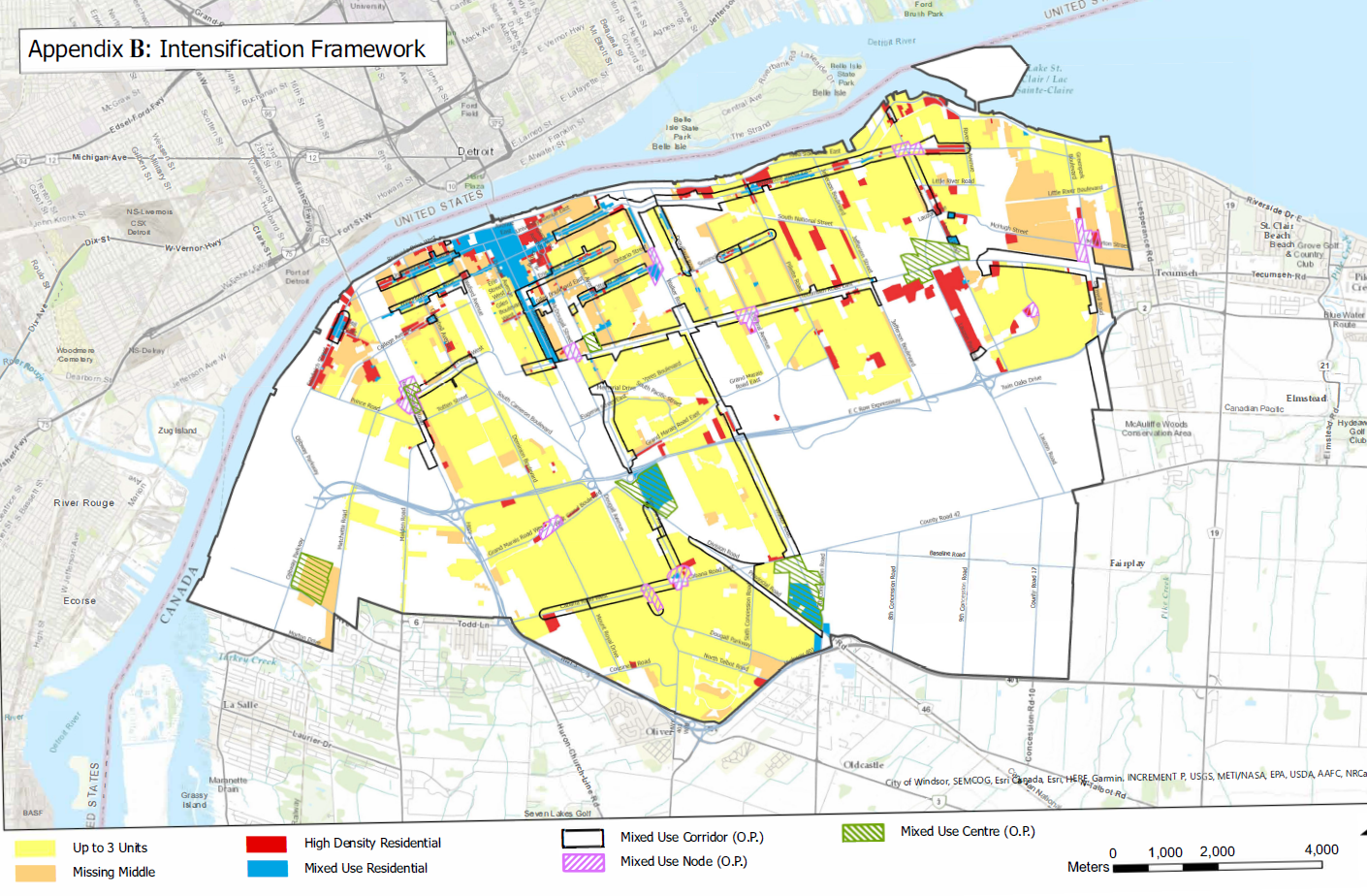 Suddenly the lands are included in the Mixed Use Centres you can also the orange “missing middle” classification applies to stretches of this land on the LaSalle border up Matchett Rd. Now maybe this change occurred previously, I am not sure, and I didn’t notice this until just this past Friday when I saw the map that kicked off this post shared but there are some big implications.